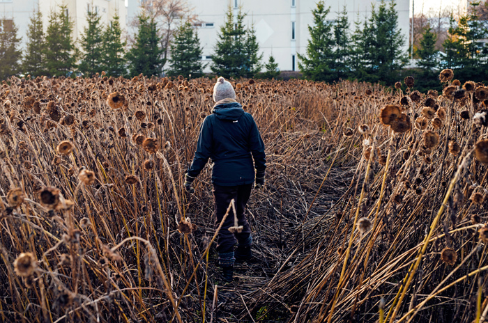 Ympäristökasvatuksen asiantuntija Pinja Sipari katselee auringonkukkien rankoja maanparannuslohkolla.
