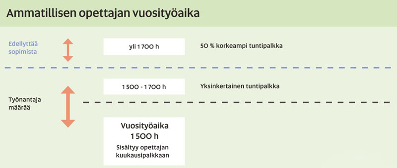 Vuosityöaika perustuu opettajan tekemiin työtunteihin. Kaikki työtehtävät tehdään työajalla. Ammatillisissa oppilaitoksissa perustyöaikaa on 1500 tuntia vuodessa. Se jaetaan sidottuun, sitomattomaan ja sellaiseen työaikaan, jossa jakoa ei tehdä.