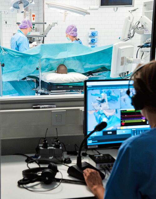 Kun hoitotyön lehtori Minna Marjamäki-Kekki ohjaa opiskelijoita lasin takaa esimerkiksi steriiliksi pukeutumisessa, oppimistilanne voidaan välittää muualla sijaitseviin luokkahuoneisiin opiskelijoiden seurattavaksi.