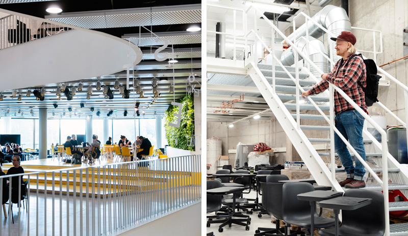 Myös talon arkkitehtuurissa on otettu huomioon opiskelijat: kampuksen tiloissa ilmastointiputket ja muu talotekniikka ovat esillä, jotta niitä on helppo havainnoida.