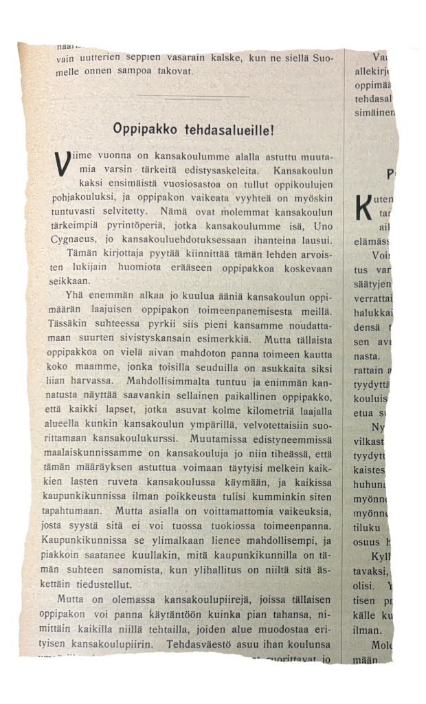 Mietinnässä oli tuolloin ehdotus paikallisesta oppipakosta kolmen kilometrin säteellä kustakin kansakoulusta. Kului kuitenkin vuosia ennen kuin oppivelvollisuuslaki saatiin lopulta säädettyä vuonna 1921.