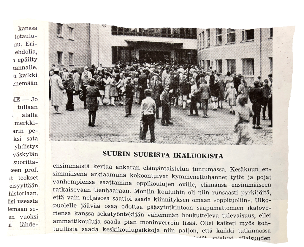 Kun nyt järjestelmää ravistelee lasten määrän väheneminen, kokonaan toisenlaisessa tilanteessa oltiin 1958. Moniin oppikouluihin oli niin paljon pyrkijöitä, että vain neljäsosa otettiin sisään.