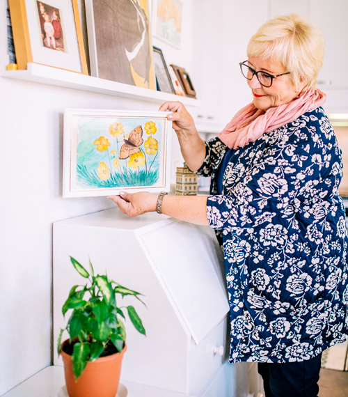 Marianne kertoo äitinsä maalanneen ja piirtäneen vielä vanhoilla päivilläänkin. Kädessään hänellä on äidin tekemä taulu.
